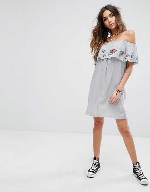 Dress by Pimkie Smooth woven fabric Floral embroidered detail Bardot neck Relaxed fit Machine wash 100% Viscose